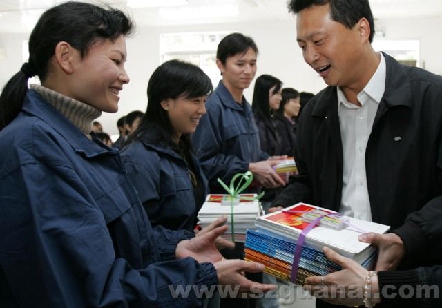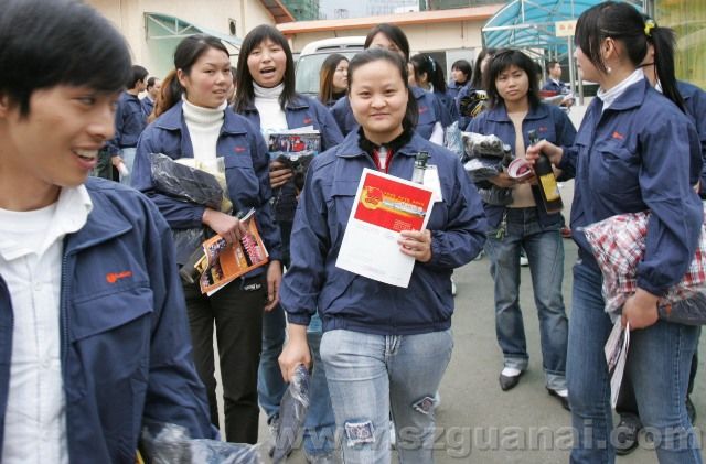 2007年1月22日下午,深圳市共青團(tuán)工作人員前往蓮塘工業(yè)區(qū)慰問外來青工。為他們帶來了電話卡,刊物以及健康飲品,祝愿他們工作順利,春節(jié)愉快。團(tuán)市委書記張文為青工們送來了精神食品。(商報記者 商報姜志強 攝影報導(dǎo))