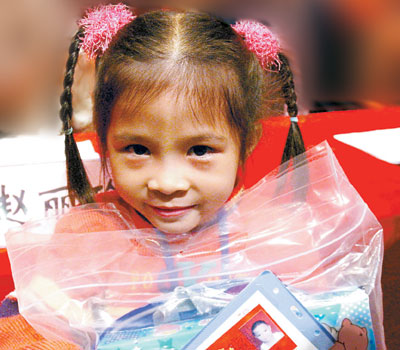 地貧兒的“親人們”從四面八方趕來(lái)。認(rèn)親家庭的“爸爸”“媽媽”們拉著地貧小朋友們的手問(wèn)長(zhǎng)問(wèn)短,感動(dòng)的淚水充盈著他們的眼睛,愛(ài)如涓涓細(xì)流無(wú)聲流淌在每個(gè)人的心中。香蜜湖獅子會(huì)會(huì)長(zhǎng)王麗芳、市民陳小姐、朱太太、顧小姐四個(gè)“媽媽”圍著“認(rèn)捐”的地貧兒袁嘉怡噓寒問(wèn)暖。“媽媽”們還帶來(lái)了5個(gè)如花似玉的“姐姐”,8歲的“小姐姐”王靖君看著“妹妹”袁嘉怡非常憐愛(ài),她說(shuō),以后我有好玩好吃的,都會(huì)想著她。我的零用錢也要分給她。富士康集團(tuán)的員工們和認(rèn)親的地貧小朋友共同植下了愛(ài)心樹(shù),而沃爾瑪公司給地貧孩子們帶來(lái)了書(shū)包、文具等愛(ài)心禮物。