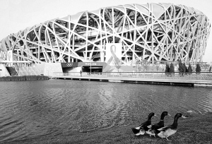 鳥巢高懸巨大紅絲帶
