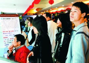昨天上午8點30分,當記者來到位于八卦二路的中國深圳人力資源市場招聘專場現場時,市場外已經排起了長長的隊伍,來自湖北洪湖的翟文文早上7點半就從家里出發,并如愿以償地在等候的隊伍中排了個第一,“這么早來就圖個新年好兆頭,希望盡快找個好工作。”翟文文2004年高中畢業后就在深圳打工,去年5月因為家中有事辭工回家,為在節后盡快找到工作,翟文文大年二十八就趕到深圳,并在深圳過春節,“我希望找一份不包吃、住每個月能拿2000元左右的工作,我以前在公司每個月可以拿3600元,但想到受金融危機影響,春節后工作可能不是很好找,我降低了自己的要求。”翟文文告訴記者。記者采訪發現,不少勞務工和翟文文一樣為了找到工作,都比往年提早返深,并適當降低薪酬等方面的要求。