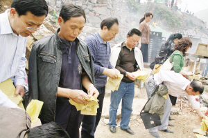 記者于是前往景家山。上山的一條水泥路上,來自外地的憑吊者絡繹不絕。半山的遙望處,山坡崎嶇,有群眾在這里設立了幾個簡單的祭祀臺。祭祀臺前,自發(fā)前來的憑吊者或點香拜祭,或久久凝望默哀肅立。時近中午,一群憑吊者顯得非常特別,看上去,他們年齡在50歲左右,個個表情凝重,動情之處潸然淚下。原來,這70多人的憑吊團隊是初中74屆、高中76屆的北川中學的畢業(yè)生,現在外地工作和生活。他們告訴記者,估計周年祭的時候人多不方便,于是就提前前來拜祭。