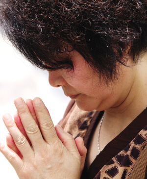 8位親人在地震中遇難的郝絲宇用望遠鏡遙望家鄉(xiāng)。