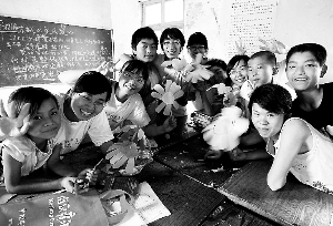 ??? 7月7日,來(lái)自杭州的大學(xué)生志愿者們?cè)跐}上縣孤殘兒童養(yǎng)育院與孤殘兒童一起展示剛制作好的手工藝品。