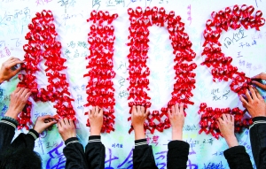 11月30日,安徽省含山縣第二中學學生用數百個紅絲帶拼成字母“AIDS”。在12月1日“世界艾滋病日”來臨前夕,安徽省含山縣第二中學開展“愛與生命同在”為主題的預防艾滋病、關愛艾滋病感染者的宣傳教育活動。新華社發