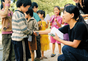 孫影為貴州山區(qū)孩子發(fā)作業(yè)本。 深圳報(bào)業(yè)集團(tuán)記者 陳錫明 攝