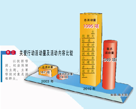 首屆深圳關(guān)愛行動開始后6年多來,深圳關(guān)愛行動共舉辦9000多項愛心活動,吸引上千萬人次熱情參與。而上月拉開溫馨大幕的第七屆關(guān)愛行動的項目達到了歷屆之最,有1000多項。7年來,深圳關(guān)愛行動共舉辦愛心活動超過10000項。其中,2010年的活動總量比2003年首屆關(guān)愛行動的活動總量增長了7.5倍;重點活動項目則增長了14倍,內(nèi)容從較為單一的扶弱助貧拓展到對各個人群的關(guān)愛(見表三)。