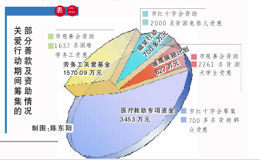 據(jù)不完全統(tǒng)計,在深圳關(guān)愛行動期間,設(shè)在市慈善會、市紅十字會及深圳關(guān)愛行動組委會辦公室的三大愛心賬戶,先后募集善款超過21億元,其中深圳市慈善會募捐超過16億元,深圳市紅十字會募捐4億多元,深圳關(guān)愛賬戶募捐8000多萬元。這些愛心善款溫暖了深圳的困難群眾,溫暖了來自祖國各地的來深建設(shè)者,溫暖了四川、隴南地震災(zāi)區(qū)的人們,溫暖了臺灣遭遇風災(zāi)的同胞。善款帶著深圳人的愛心流向千家萬戶,受惠群眾超過一億人。更為可喜的是,我市對困難群體的關(guān)愛,已經(jīng)形成了長效機制,眾多困難群體獲得了救助。(見表二)