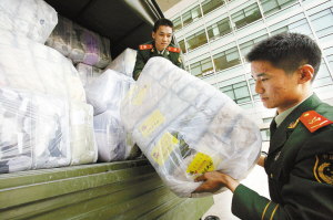 向甘肅捐贈防寒衣被。 藍軍/攝