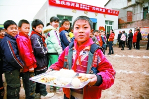 “好吃!好吃!真好吃!” 把盤子里的最后一粒米也吃得干干凈凈后,11歲的小兵從餐桌上起身把盤子和筷子送到了廚房。3月4日中午,劉伯承元帥故里——重慶開縣周都村小學(xué)“媽媽食堂”正式開伙,和小兵一樣,這所學(xué)校的孩子從此開始吃上干凈、衛(wèi)生、可口的飯菜。