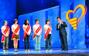 ??? 昨晚(4月28日)8時,2011感動深圳——第八屆深圳關愛行動表彰晚會在深圳大劇院舉行,十大最具愛心人物、十大最具愛心家庭、十大最具愛心企業、十大最具愛心社區等受到隆重表彰。圖為晚會主持人白巖松(右一)采訪最具愛心人物“爽媽”陳超英。