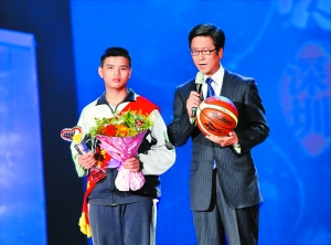 中央電視臺著名主持人白巖松在晚會上采訪最具愛心人物、坪山中學初三學生羅新雄。