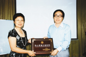 市慈善會(huì)秘書長(zhǎng)房濤向陳德勛(右)頒發(fā)“熱心慈善公益機(jī)構(gòu)”牌匾。