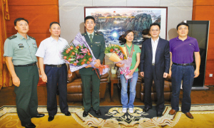 昨天,“全國道德模范”孫影(左二)和獲得“全國道德模范”提名的駐港部隊軍官黃立明(左一)載譽歸來。
