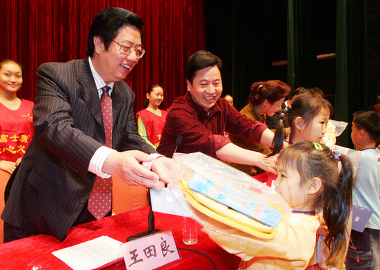 深圳報業集團總編輯、深圳特區報社總編輯、第三節關愛行動組委會副秘書長王田良(前左一)等領導向地貧兒發放燃料卡和愛心禮物。