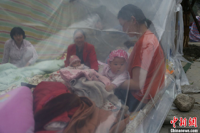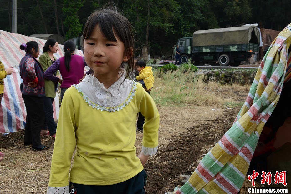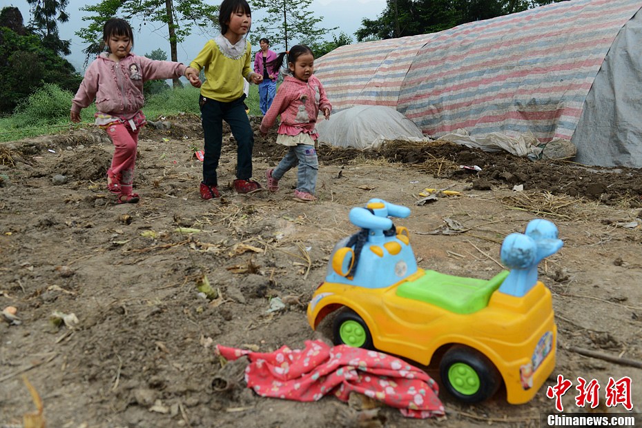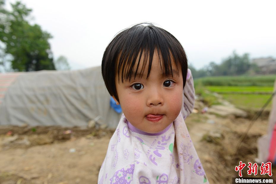 4月21日,四川雅安蘆山縣龍門鄉(xiāng)一位在簡易帳篷外玩耍的小孩。中新社發(fā) 張?jiān)?攝