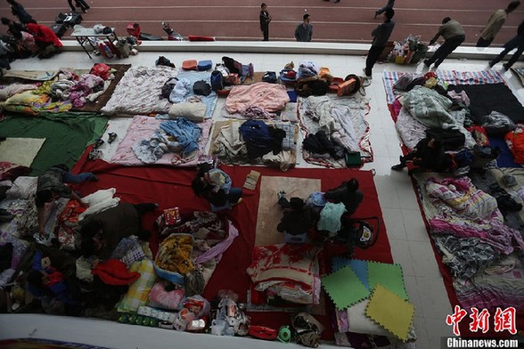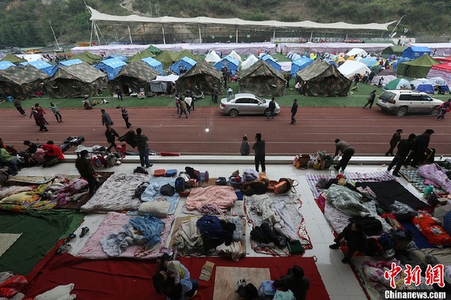 寶興縣中學(xué)操場成為寶興縣最大的災(zāi)民安置點(diǎn),災(zāi)民們在操場看臺等地暫時(shí)安家。許云峰 攝