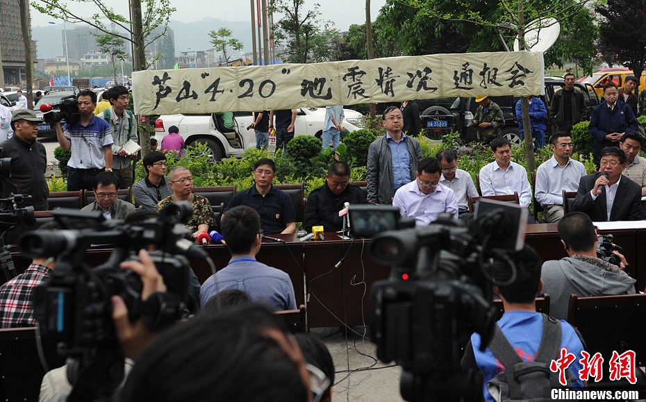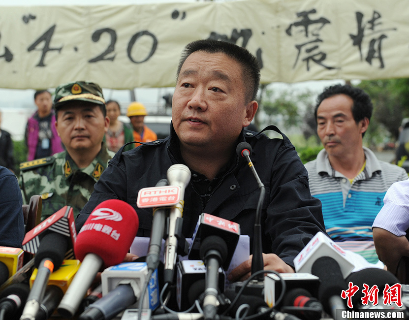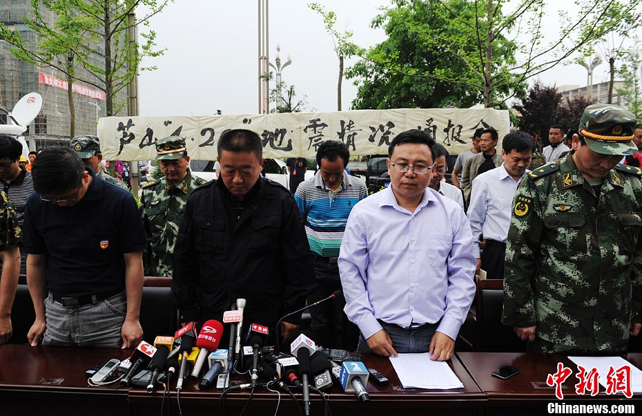 4月21日下午,四川雅安市在蘆山震災(zāi)區(qū)召開抗震救災(zāi)通報(bào)會,通報(bào)會上集體向“4.20”地震遇難同胞默哀,期間還兩次發(fā)生余震。截至21日地震已導(dǎo)致當(dāng)?shù)?68人遇難,24人失蹤,10871人受傷。已發(fā)生余震1606次,最大余震5.4級。圖為雅安市政府副市長廖磊通報(bào)震情。中新社發(fā)劉忠俊 攝