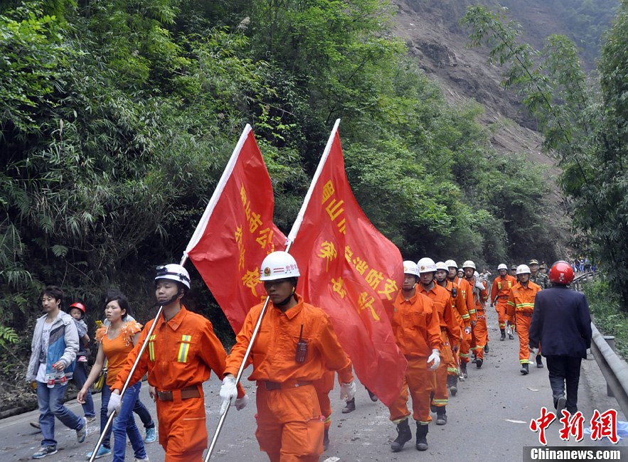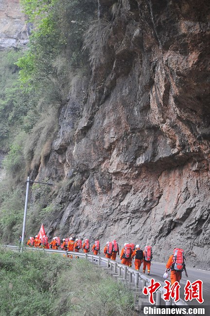 4月20日,南充消防22人救援先鋒隊(duì),每人攜帶30斤的必備裝備器材,路徑峽口頭、靈關(guān)中壩等地,徒步行進(jìn)達(dá)50余公里安全挺進(jìn)寶興展開抗震救災(zāi)工作。中新社發(fā)南充消防 攝