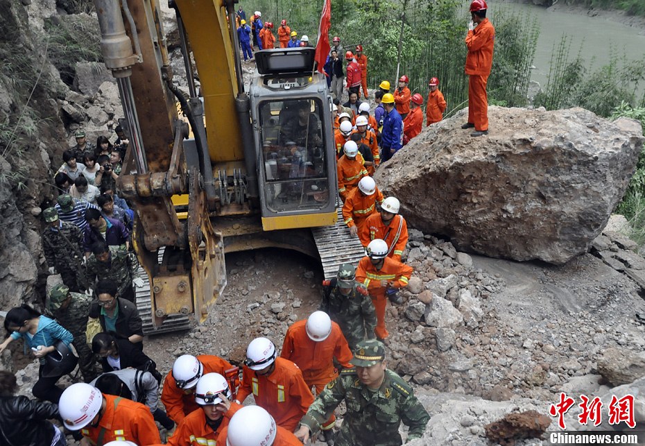 在4.20雅安地震發(fā)生后,震區(qū)道路堵塞始終是救援死結(jié)。圖為山上震下的巨石擋路,救援人員正在小心通過。中新社發(fā) 肖遠(yuǎn)攝