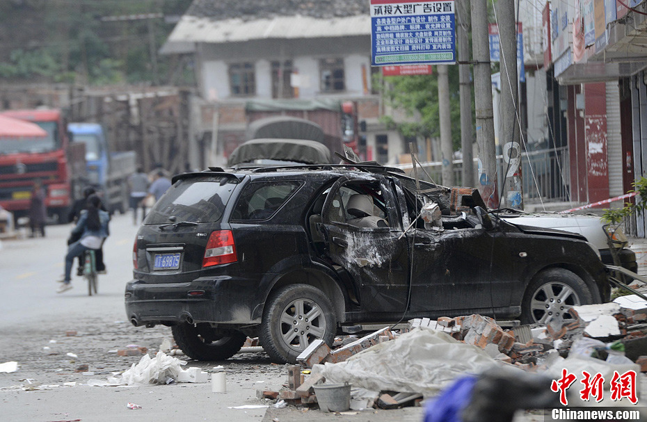 4月21日,四川省雅安市寶興縣靈關(guān)鎮(zhèn),街頭的受損車輛。中新社發(fā)廖攀 攝