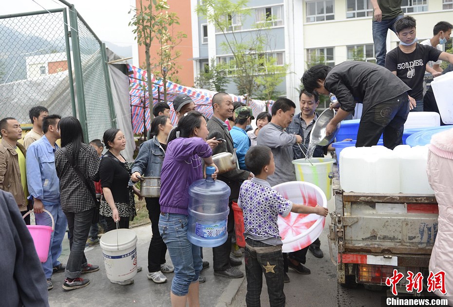 4月21日,四川省雅安市寶興縣靈關(guān)鎮(zhèn)靈關(guān)中學(xué)災(zāi)民安置,志愿者為災(zāi)民送水。中新社發(fā) 廖攀 攝