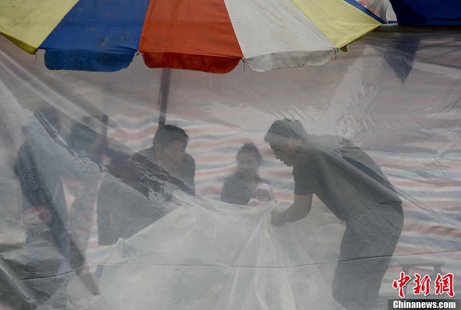 4月21日,四川省雅安市寶興縣靈關(guān)鎮(zhèn),靈關(guān)中學(xué)安置點(diǎn)災(zāi)民用塑料薄膜搭建抗震房。中新社發(fā) 廖攀 攝