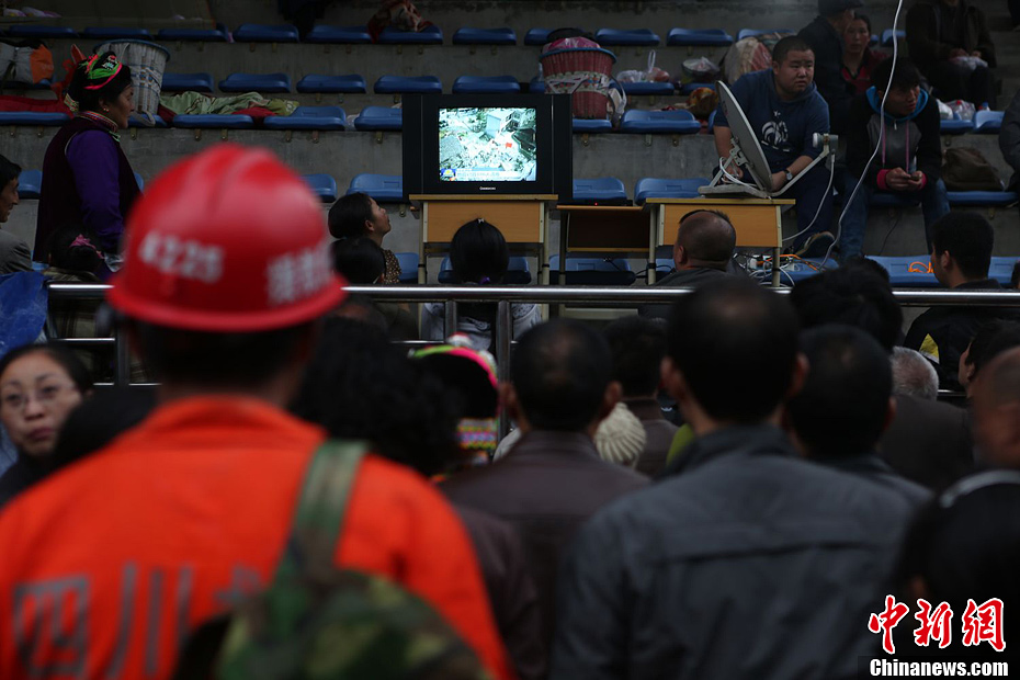 21日晚7時(shí)許,寶興縣中學(xué)災(zāi)民安置點(diǎn)內(nèi),災(zāi)民們正在觀看央視《新聞聯(lián)播》有關(guān)雅安地震的報(bào)道。許云峰 攝