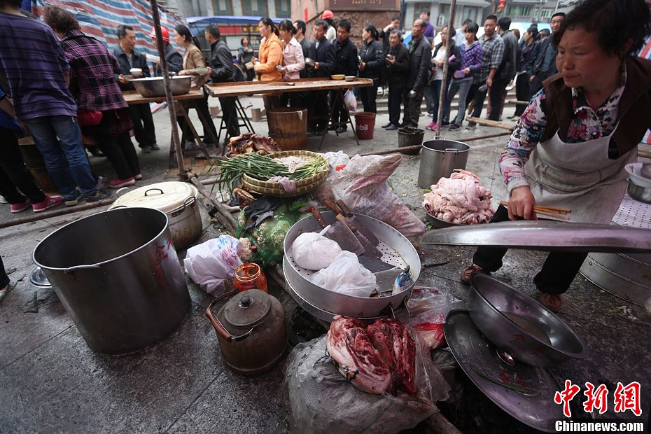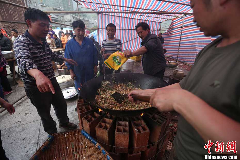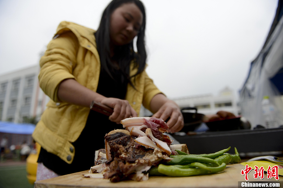 4月21日,四川省雅安市寶興縣靈關(guān)鎮(zhèn),安置在靈關(guān)中學(xué)的居民動用自家老臘肉做飯。廖攀 攝