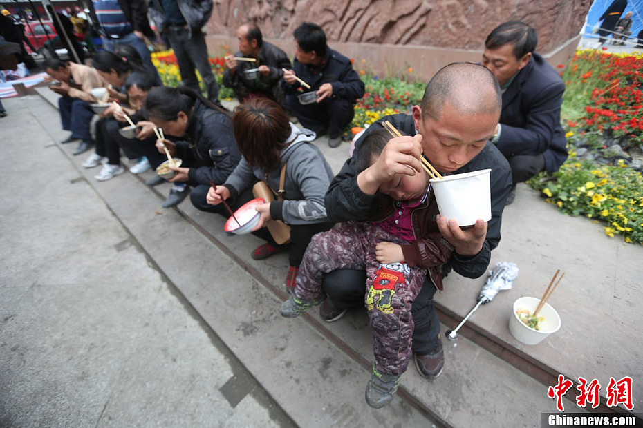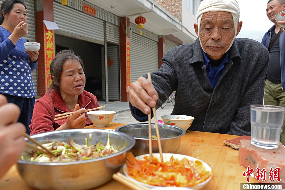4月21日下午2點(diǎn),蘆山縣龍門鄉(xiāng)75歲的村民傅玉潤(右一),地震以來第一次吃上了大米飯。從4月20日地震發(fā)生時(shí)傅玉潤被掉落的磚塊砸傷頭部,現(xiàn)已無大礙。中新社發(fā)張?jiān)?攝