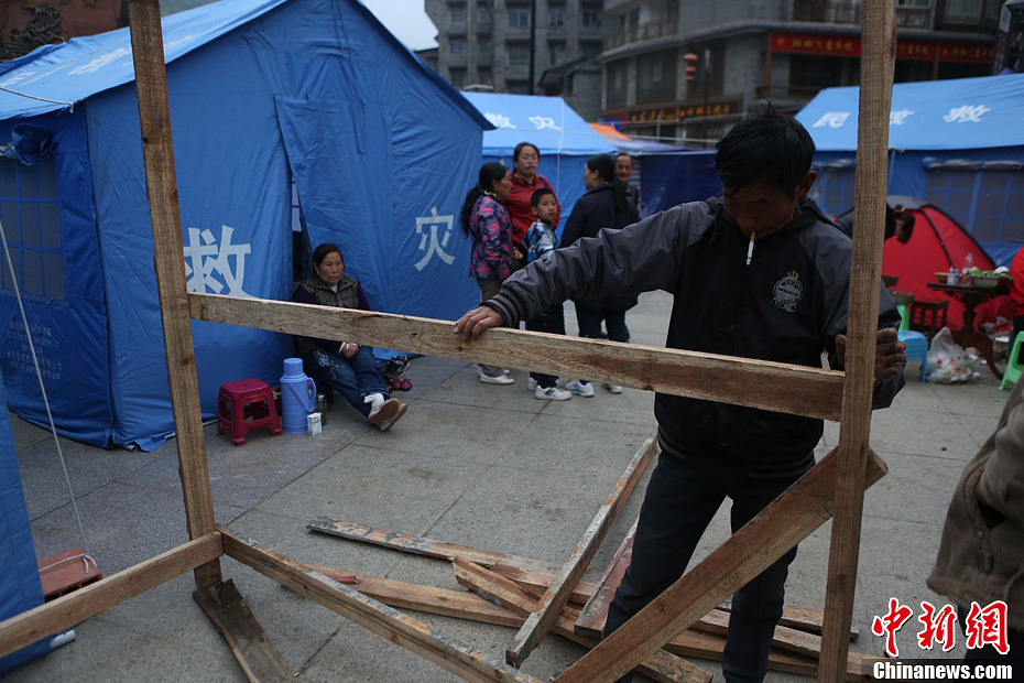 4月21日,四川省雅安市寶興縣靈關(guān)鎮(zhèn),安置在靈關(guān)中學(xué)的居民搭建抗震房。廖攀 攝