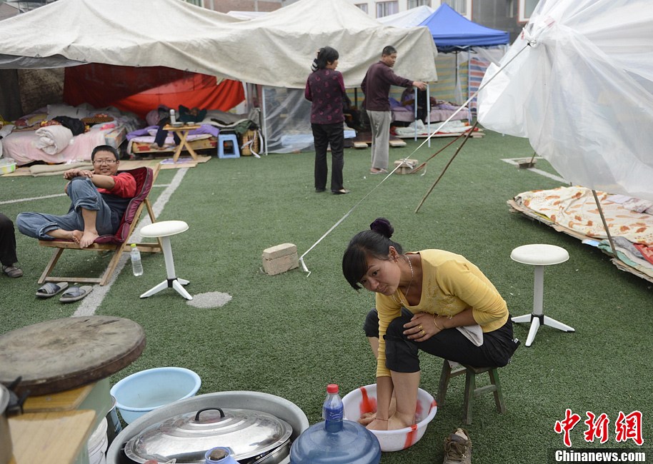 4月21日,四川省雅安市寶興縣靈關(guān)鎮(zhèn),靈關(guān)中學(xué)內(nèi)的避難災(zāi)民在泡腳。廖攀 攝