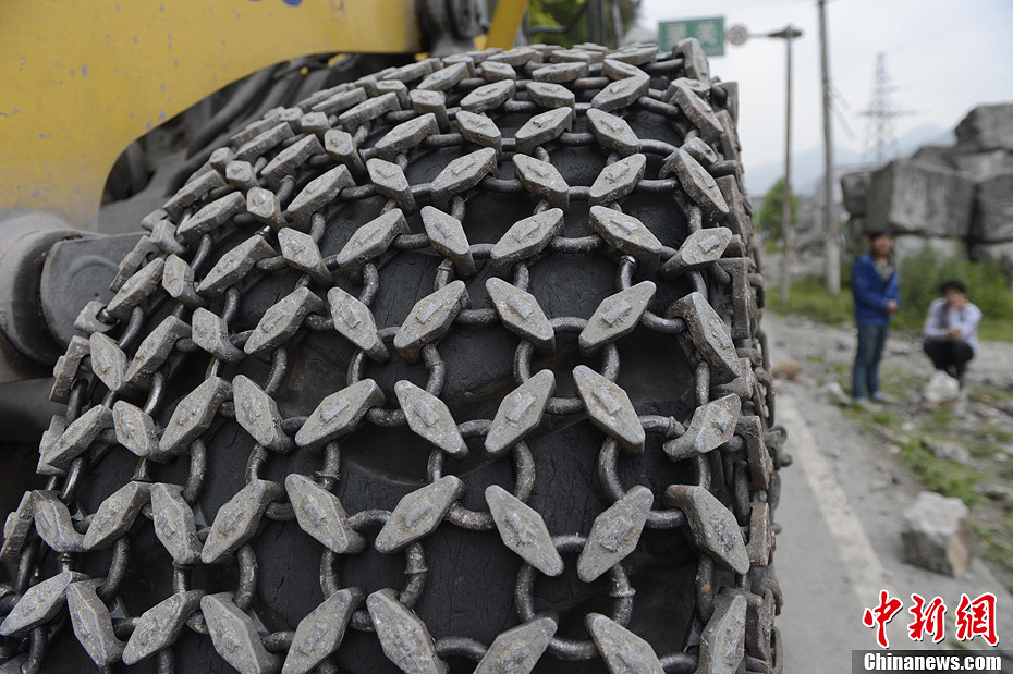 4月21日,四川省雅安市寶興縣靈關(guān)鎮(zhèn)施工車輛輪胎穿上了鐵鏈。廖攀攝