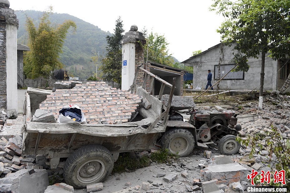 4月21日,四川省雅安市寶興縣靈關(guān)鎮(zhèn),受損的建筑和拖拉機(jī)。廖攀攝