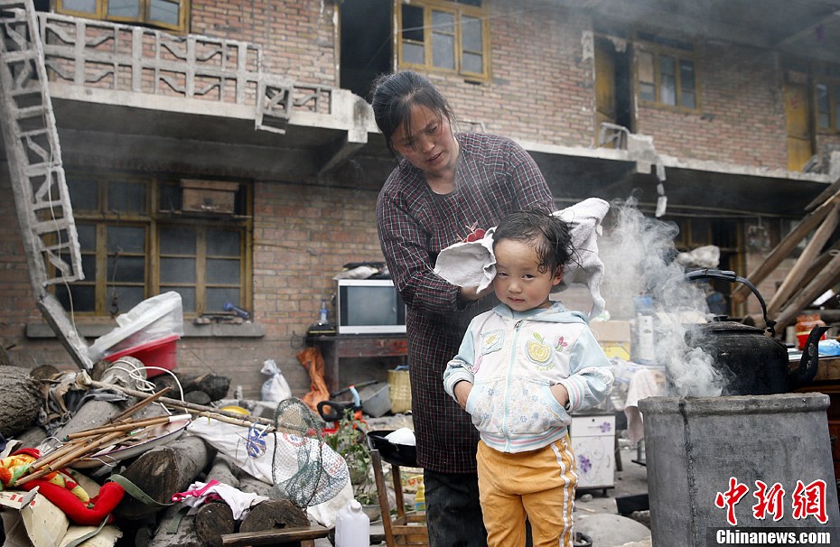4月21日,四川雅安地震重災(zāi)區(qū)蘆山龍門鄉(xiāng)隆興村,在得到足夠水后,一位小朋友在震后得以第一次洗頭。中新社發(fā) 張浩 攝