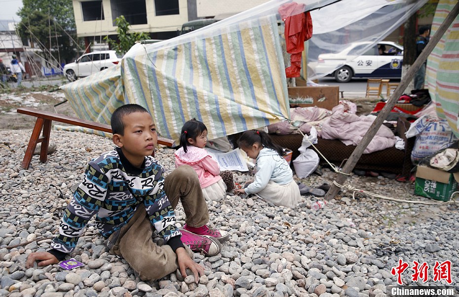 4月21日,四川雅安地震重災(zāi)區(qū)蘆山龍門鄉(xiāng),三位留守兒童在震后住進(jìn)了簡易棚中,其中一個(gè)孩子一邊玩著鵝卵石一邊看著救援隊(duì)員在搬運(yùn)物資。在雅安遭受地震災(zāi)害的許多村子里,許多父母都外出打工,留下了年邁的長輩和幼小的孩子。中新社發(fā)張浩 攝