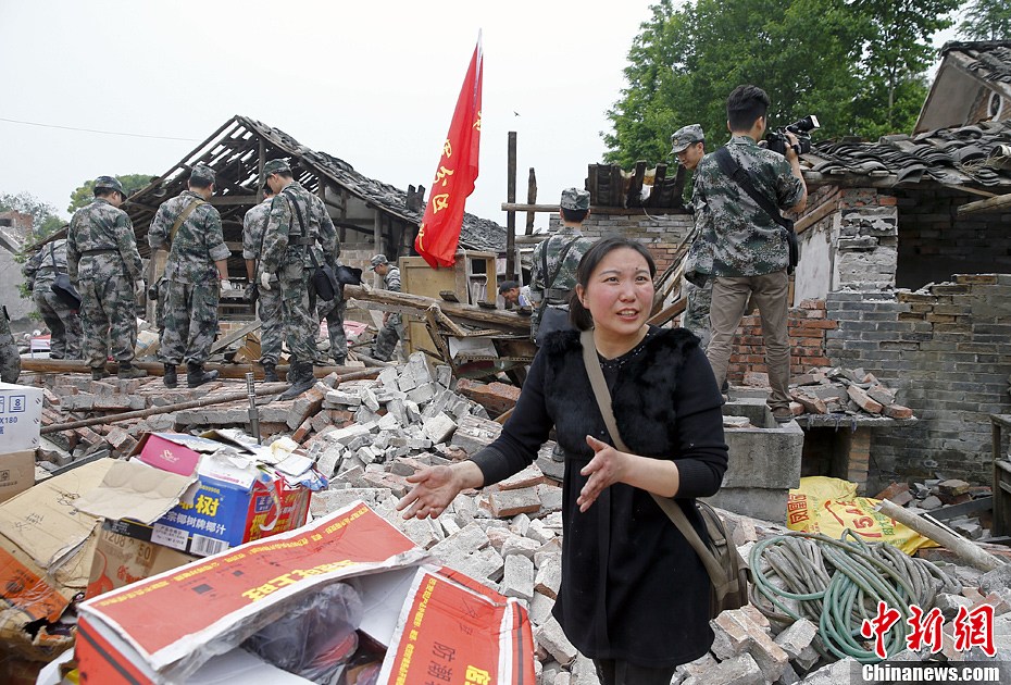 4月21日,四川雅安地震重災(zāi)區(qū)蘆山龍門鄉(xiāng),一名百貨店的老板正在講述她震后的經(jīng)歷,而她身后的官兵們正在幫她搜出散落的百貨。中新社發(fā)張浩 攝