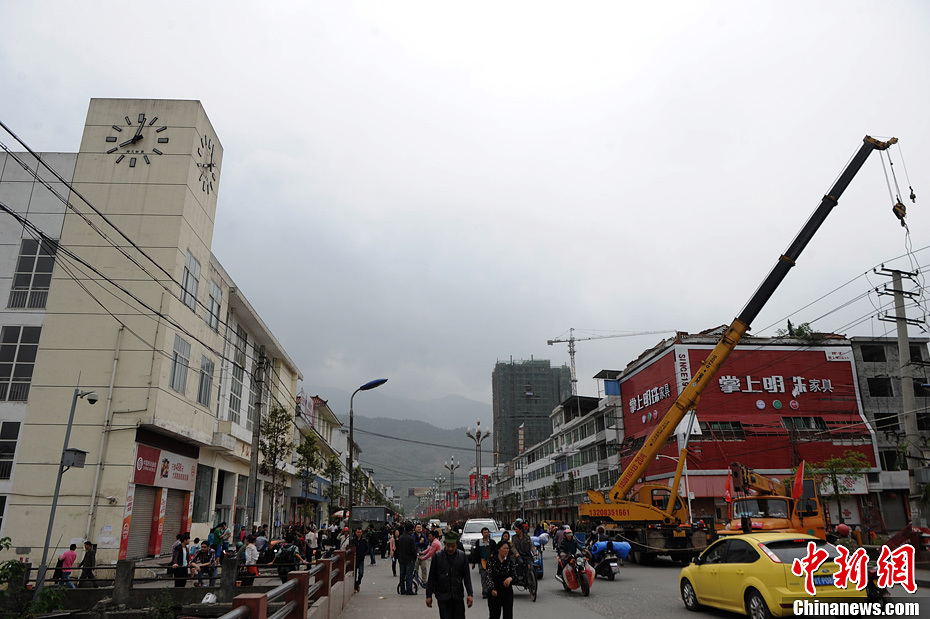4月21日,四川雅安市蘆山縣城里塔吊正對倒塌的電線桿實(shí)施搶險(xiǎn)救援,左面商業(yè)樓的時(shí)鐘定格在8時(shí)2分。據(jù)四川省民政廳4月21日17時(shí)統(tǒng)計(jì),四川雅安、成都、眉山、自貢、德陽、綿陽、樂山、遂寧、南充、宜賓、內(nèi)江、達(dá)州、廣安、資陽、甘孜、阿壩和涼山17個(gè)市州104個(gè)縣150余萬人因震受災(zāi),184人死亡。中新社發(fā)陳超 攝