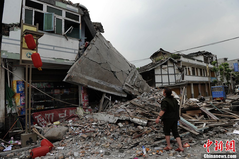 4月21日,四川蘆山縣街道上隨處可見垮塌房屋。4月20日8時(shí)2分,四川省雅安市蘆山縣(北緯30.3,東經(jīng)103.0)發(fā)生7.0級地震, 震源深度13公里。中新社發(fā) 陳超 攝