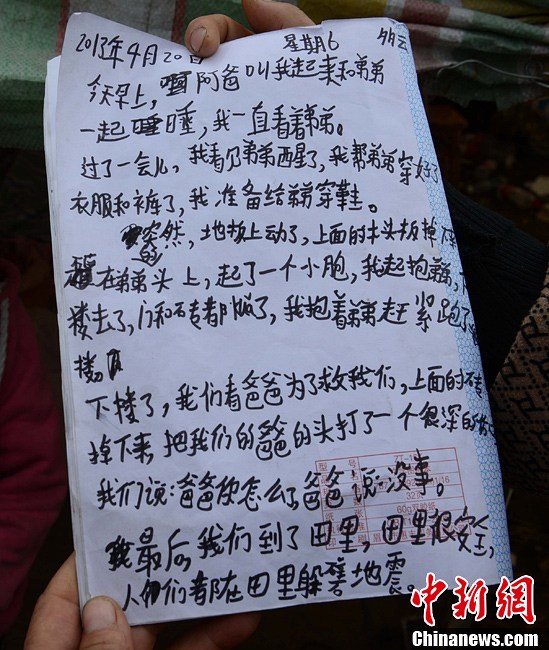 4月21日,圖為高夢思記錄當(dāng)天事情經(jīng)過的日記。4月20日,蘆山縣龍門鄉(xiāng),地震發(fā)生時(shí)9歲的高夢思在和4歲的弟弟在家,一塊木板砸在弟弟的頭上,高夢思一把抱起弟弟到了安全的地方,檢查后弟弟只是受了些輕傷。中新社發(fā)張?jiān)?攝