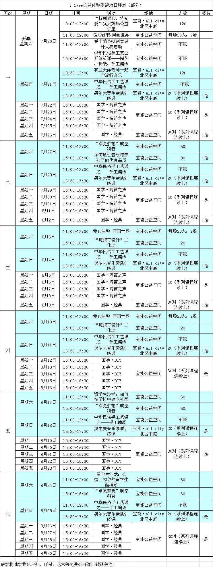 ????20日上午,V-care寶能公益空間正式揭幕,V-care暑期公益體驗季系列活動率先展開。7月20日至8月30日,包括愛心涂鴨、航天科普、手工拼豆、音樂、陶笛、DIY、舊物改造、留學(xué)生沙龍、戶外、環(huán)保、藝術(shù)等近百場活動將陸續(xù)向市民免費開放。