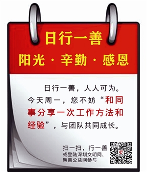 ????深圳特區報訊 (記者 韓文嘉)“莫以惡小而為之,莫以善小而不為”。日前,深圳市文明辦在全市發起了“日行一善”文明實踐活動,號召全體市民踐行社會主義核心價值觀和“陽光·辛勤·感恩”理念,每天動一善念,隨手而為日常小善,倡導不斷提升城市文明程度,共同打造愛心家園。