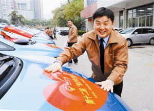 鵬程電動汽車出租有限公司愛心車隊隊員一大早就在現場集結,把愛車裝扮一新。