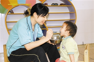 “我們這里的孩子都姓寶,寶貝疙瘩的寶。”費英英一邊給記者介紹,一邊輕輕抱起每一個孩子。量體溫、洗澡、換尿片、喂飯、曬太陽……朝夕相處中,費英英熟悉每一個孩子的名字,知道他們的喜怒哀樂,用愛心呵護每一位孤殘兒童,用親情讓他們感受“家”的溫馨。