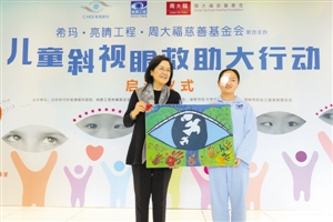 ??? 10月13日是世界視覺日,深圳希瑪林順潮醫(yī)院、亮晴工程慈善基金會、周大福慈善基金會聯(lián)合主辦的“希瑪·亮睛工程·周大福-兒童斜視眼救助大行動”啟動。圖為受助的孩子向周大福慈善基金副理事長劉璞女士贈送自己的畫作。深圳商報記者 李博 攝