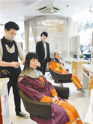 環(huán)衛(wèi)工人享受免費美發(fā)服務。