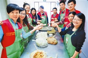 平湖街道的各個社區,也分別根據老人們的實際情況,展開形式各異的冬至活動,上木古社區的民生大盆菜項目——老年人“俏夕陽”節日關懷便是其中之一。在節日當天,社區的婦女、義工們齊聚一堂,為老人們包餃子,制作各類精美食物。為了保證老人們吃得健康,上木古社區在每一個制作環節都特別注意衛生把關,每位婦女和義工都要求戴口罩和手套,確保食材的干凈衛生。