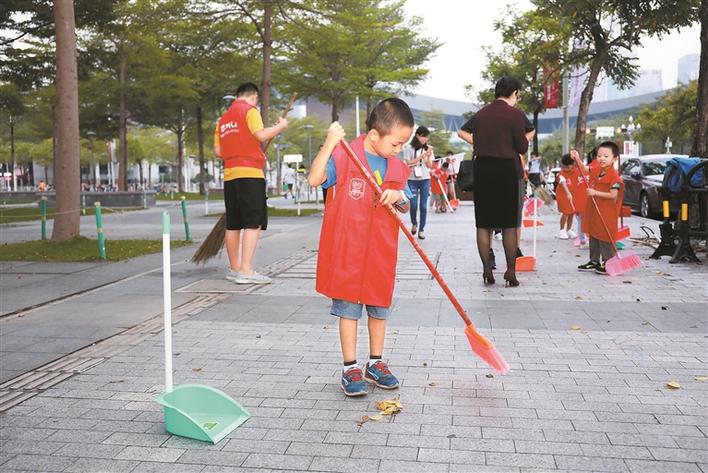 清晨5點多,晨曦微露,百余位熱心的小志愿者就陸續(xù)來到了福田區(qū)、羅湖區(qū)、南山區(qū)的活動現(xiàn)場。他們?nèi)齼沙山M,分工明確,有的負責清掃,有的負責清運。在中心書城活動現(xiàn)場,一位小志愿者用夾子將花池邊的煙頭一個個夾進垃圾袋;一位小男孩細心地用手將嵌進地磚縫的牙簽、果殼摳出。5歲男孩冀泓琿拿著比自己還高的掃帚,在爸爸的指導下將落葉掃進簸箕;7歲的玄梓涵麻利地清掃著垃圾,不一會兒就把媽媽落在了后面。活動從5點持續(xù)到7點半,幾條路清掃下來,小志愿者們額頭上冒出了汗珠,汗水濕透了衣衫。