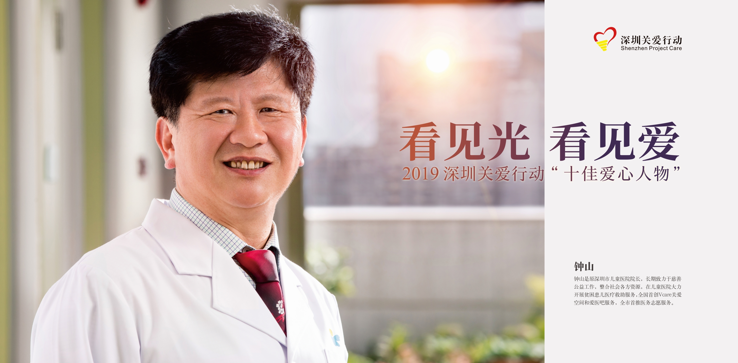 男,深圳市兒童醫院院長。鐘山致力于慈善公益工作,整合資源幫助和服務貧困患兒及其家庭,獲國家、省市各級領導高度肯定。他推動兒童醫院大力開展貧困患兒醫療救助服務,十年來共為近1600位貧困患兒申請及募集醫療救助款約4500萬元,減免醫療費用近500萬元。攜手深圳市關愛辦,全國首創Vcare關愛空間,為住院患兒及家長提供減壓服務,迄今服務逾 17.5 萬個家庭;聯合深圳市及福田區義工聯全市首推醫務志愿服務,改善醫院就醫秩序,提升患兒及家長就醫體驗;攜手社會力量關愛醫務人員,全國首創愛醫吧服務,幫助醫務人員減壓,提高團隊凝聚力,更好地服務患兒。