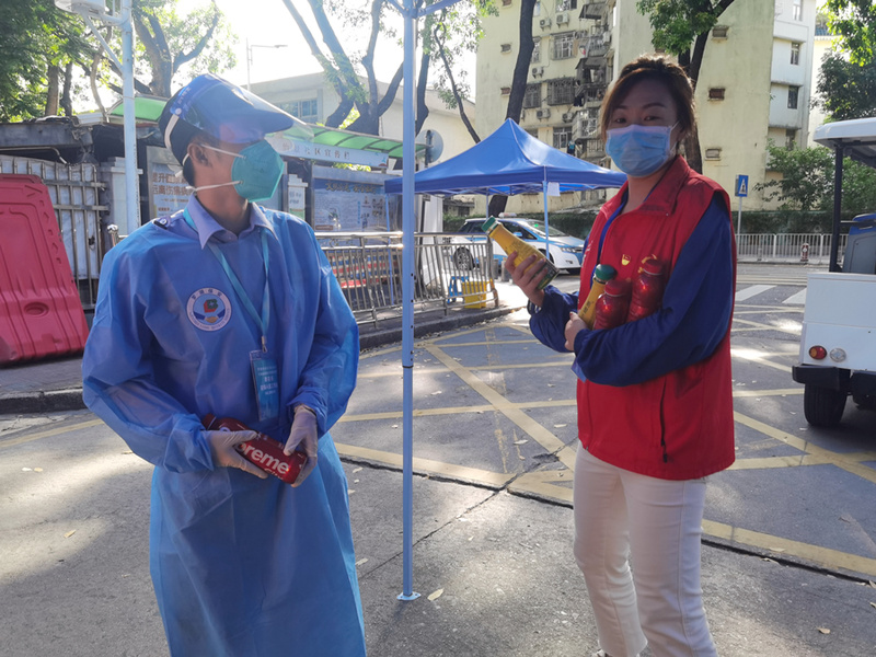 ▲羅湖街道的社區(qū)防疫人員和志愿者拿到了愛心飲料。(深圳晚報記者 易芬 攝)