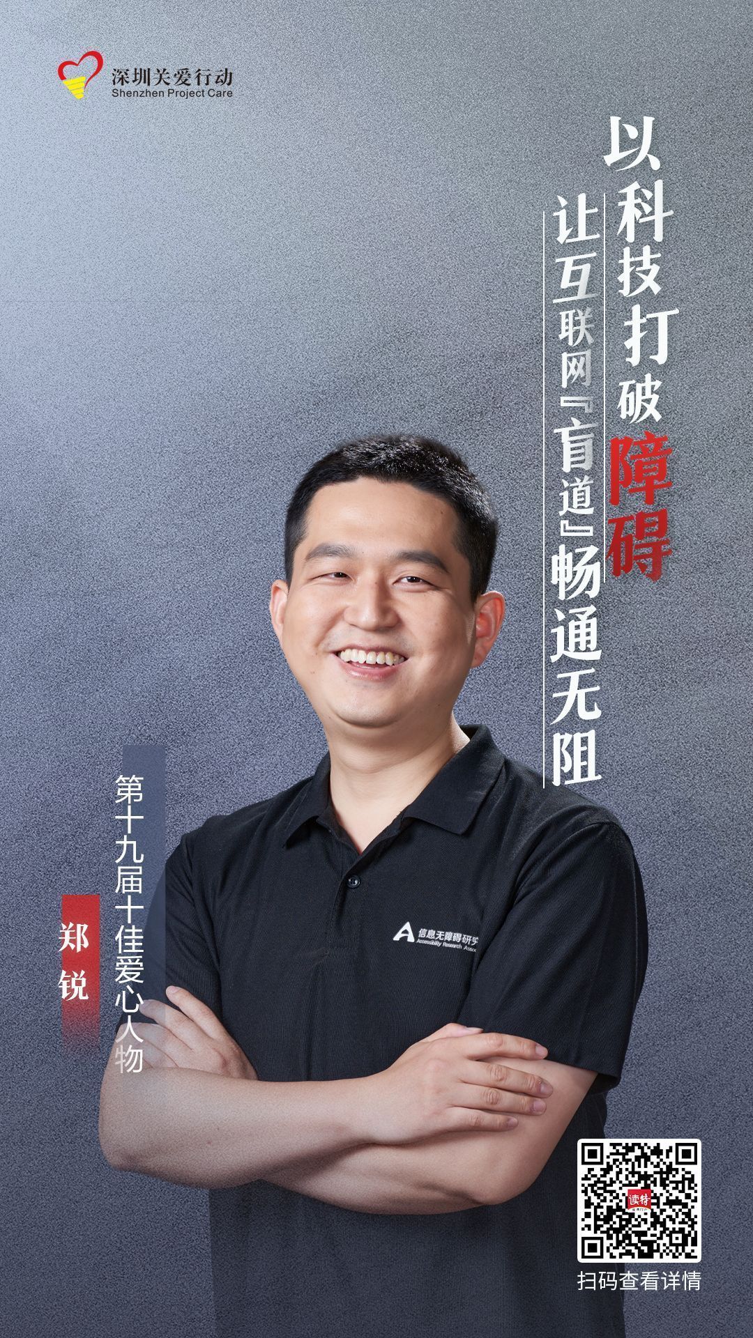 南山區(qū)盲人協(xié)會(huì)主席。鄭銳是一名盲人,而他說(shuō)自己是一名“盲探”,探索多彩的生活,也為更多的盲人探索道路。疫情期間,他開(kāi)發(fā)國(guó)內(nèi)首個(gè)無(wú)障礙疫情資訊小程序,讓視力障礙者可以無(wú)障礙地獲取疫情資訊,疫情期間每日訪問(wèn)的視障朋友高達(dá)2萬(wàn)多人。他還為企事業(yè)單位、互聯(lián)網(wǎng)公司員工提供無(wú)障礙和精準(zhǔn)助盲培訓(xùn),培訓(xùn)后,許多辦事大廳安裝了適合殘疾人辦事所需的輔助器具如讀屏軟件、手寫(xiě)板、語(yǔ)音輸入器等設(shè)備,并有受過(guò)培訓(xùn)的工作人員為殘疾市民提供無(wú)障礙服務(wù)。他還在互聯(lián)網(wǎng)短視頻平臺(tái)分享視障者日常生活和普及無(wú)障礙相關(guān)內(nèi)容,想讓更多人重新認(rèn)知?dú)堈先后w。推動(dòng)“無(wú)障礙環(huán)境”建設(shè),不讓一個(gè)人在數(shù)字世界中掉隊(duì),是他最大的心愿。